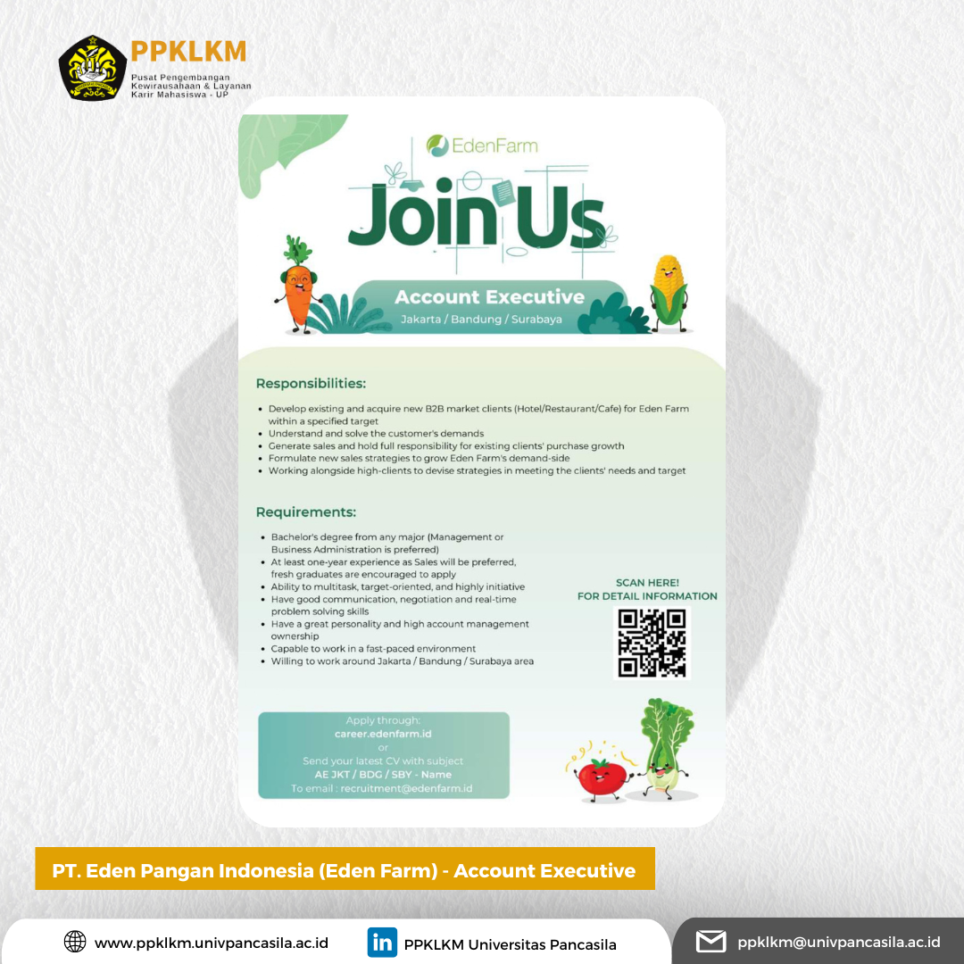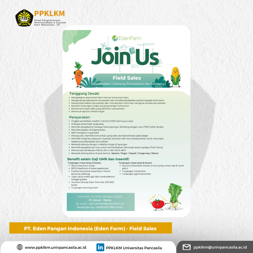 PT. Eden Pangan Indonesia (Eden Farm) is currently opening job vacancies for the Account Executive, IT Implementor, Field Sales