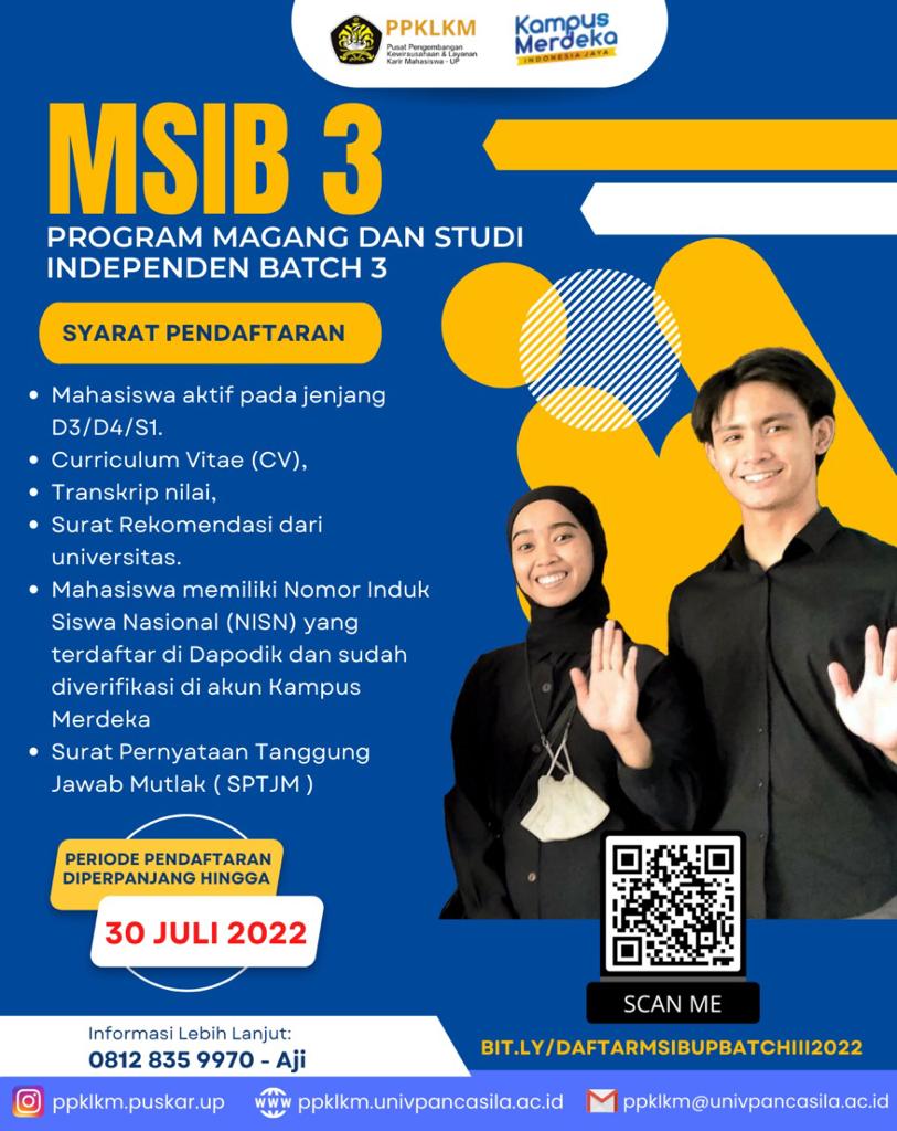 Pendaftaran diperpanjang sampai 30 Juli 2022 dengan mengklik link berikut : bit.ly/DaftarMSIBUPBatchIII2022