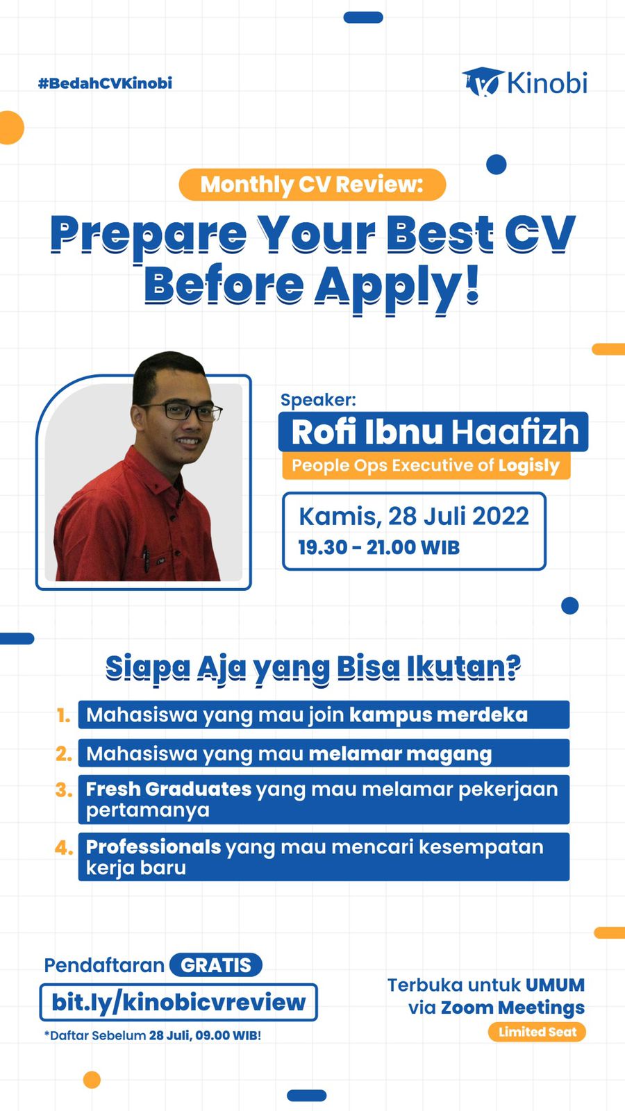 Prepare Your Best CV Before Apply!Dimana Kinobi akan sharing bareng sama kamu gimana caranya kita bisa improve CV kita bareng-bareng dalam workshop ini dan akan ada CV review session di akhir acara juga loh!