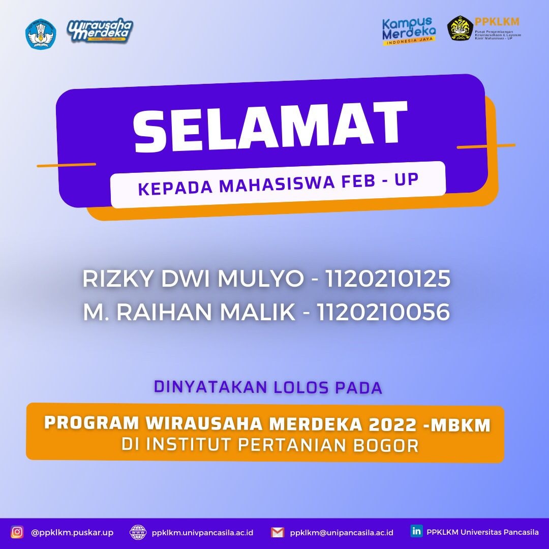 Kami ucapkan selamat kepada Mahasiswa FEB Universitas Pancasila yang dinyatakan lolos pada Program Wirausaha Merdeka 2022: