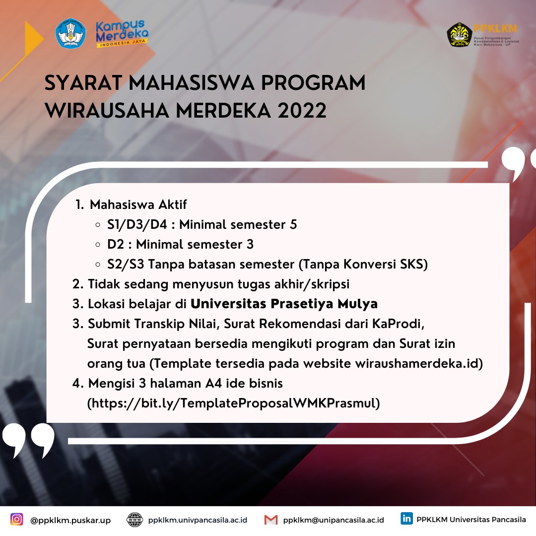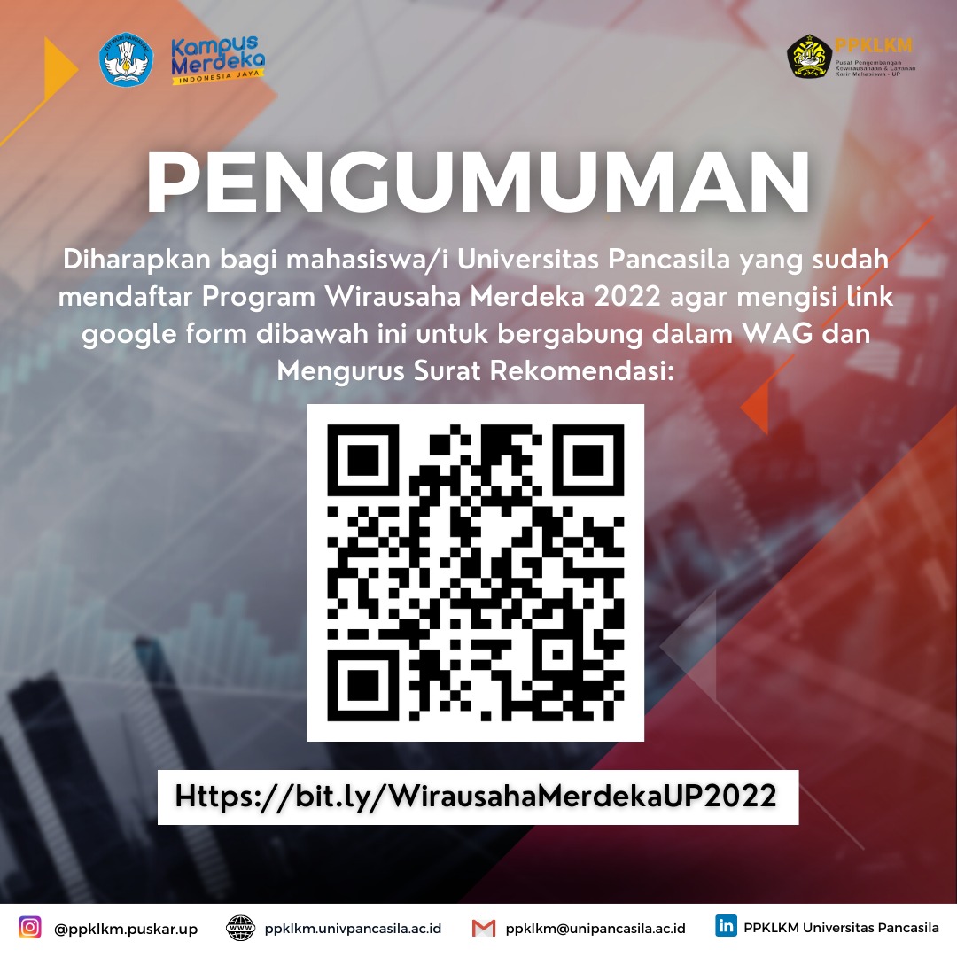 Diharapkan bagi mahasiswa/i Universitas Pancasila yang memiliki ketertarikan atau yang sudah mendaftar Program Wirausaha Merdeka 2022 agar mengisi link google form dibawah ini :