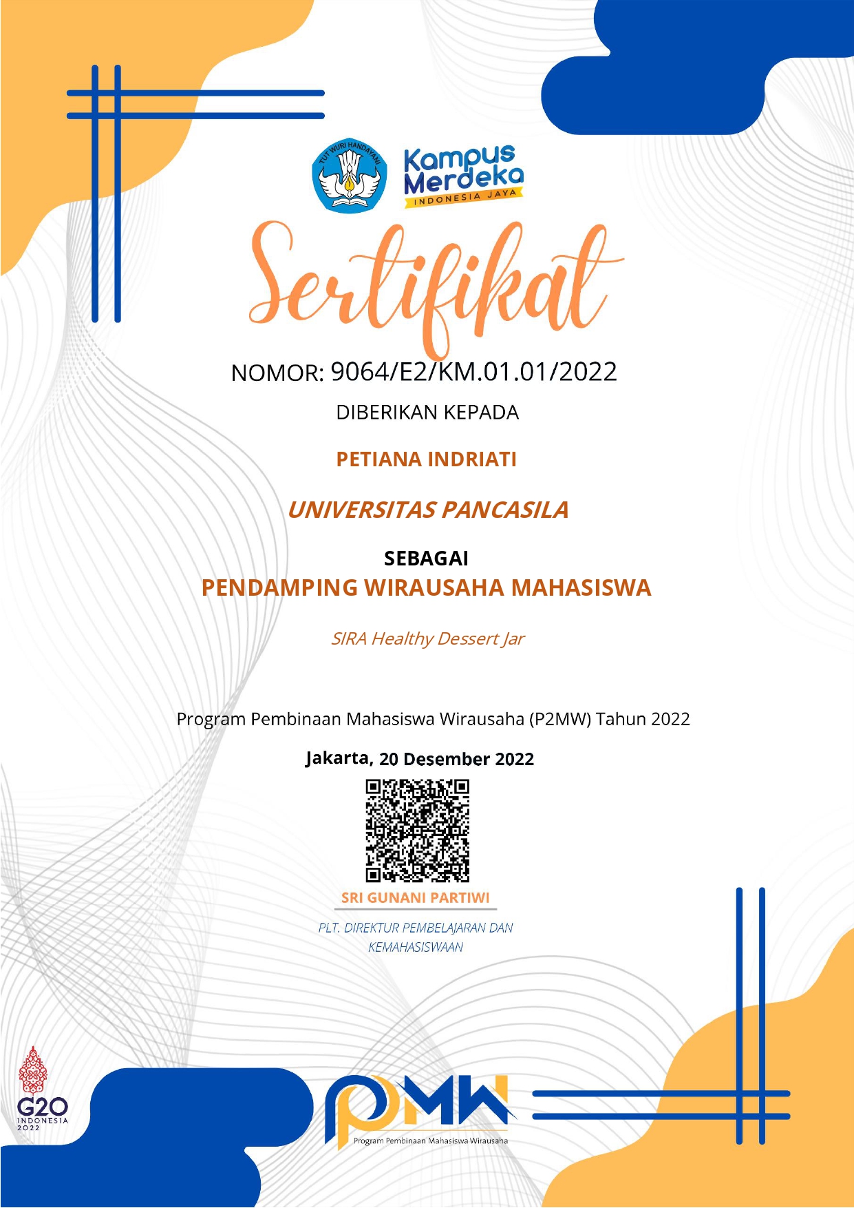 Pendampingan pembinaan lanjutan kepada 2 (dua) pemenang Hibah Program Pembinaan Mahasiswa Wirausaha (P2MW) 2022 oleh dosen Pendamping, Ka. PPKLKM - Ir. Petiana Indriati, MMKelompok SIRA Healthy Dessert Jar, pada pendampingan kali ini mendapatkan bimbingan dan solusi terkait perizinan dan legalitas usaha.