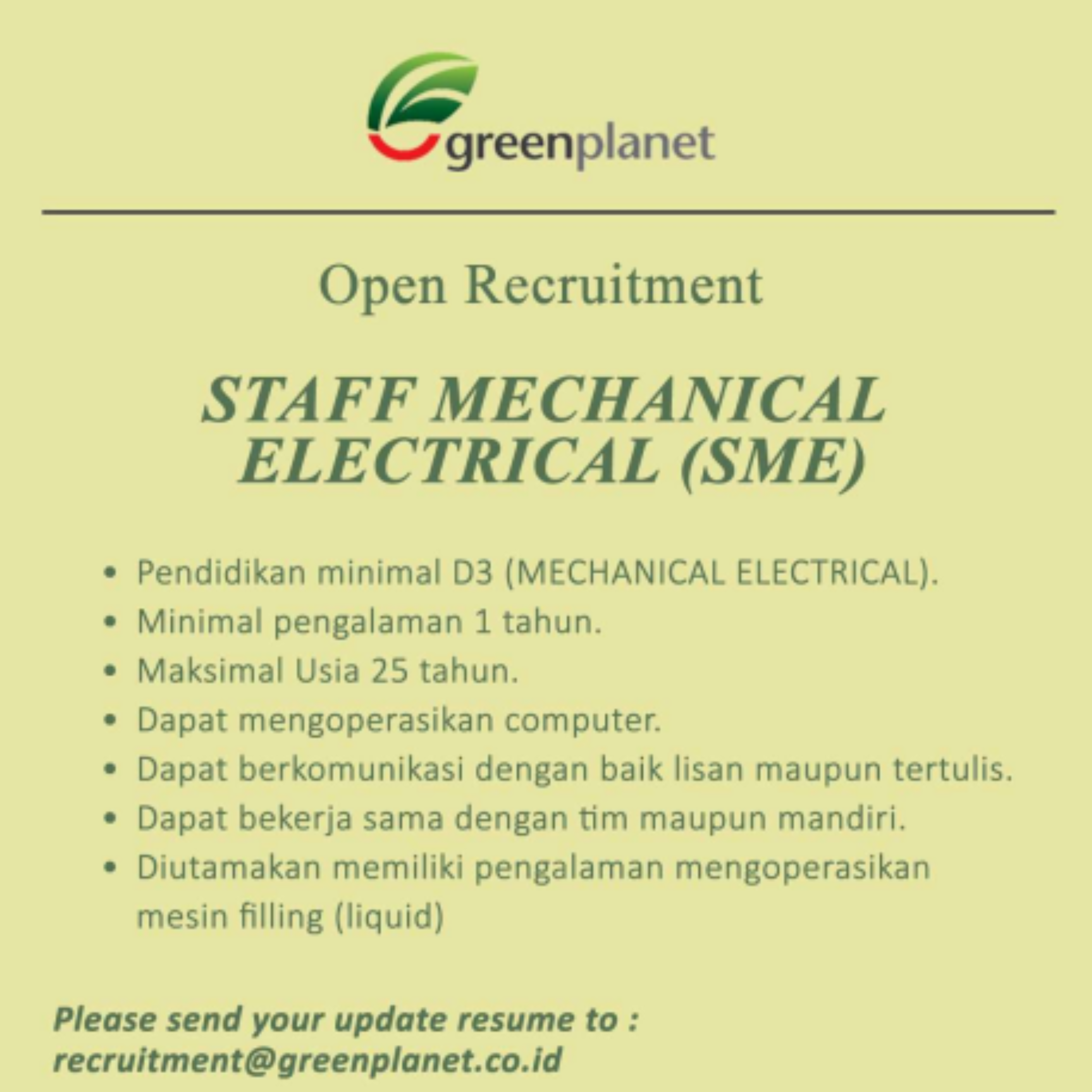 PT. GREEN PLANET INDONESIA saat ini sedang membuka kesempatan untuk kalian para freshgraduate pada posisi Electrical Technician, Mechanic Staff, Prototype & Test Engineer.