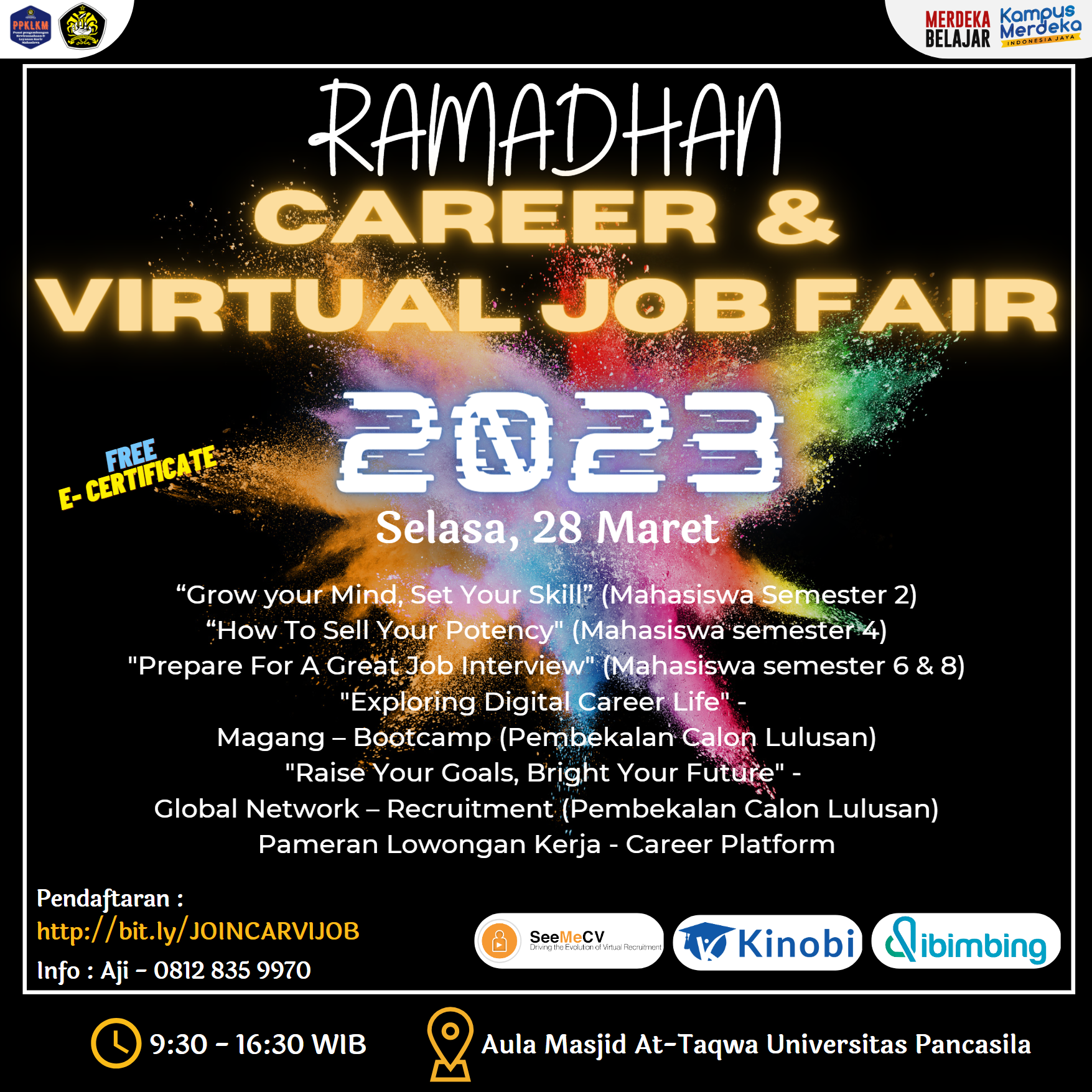 Pusat Pengembangan Kewirausahaan Layanan Karir Mahasiswa Universitas Pancasila akan mengadakan Ramadhan Career & Virtual Job Fair "Unlock Your Career Potensial, Enter the working work confidently" yang akan diselenggarakan pada :Hari / Tanggal : Selasa, 28 Maret 2023